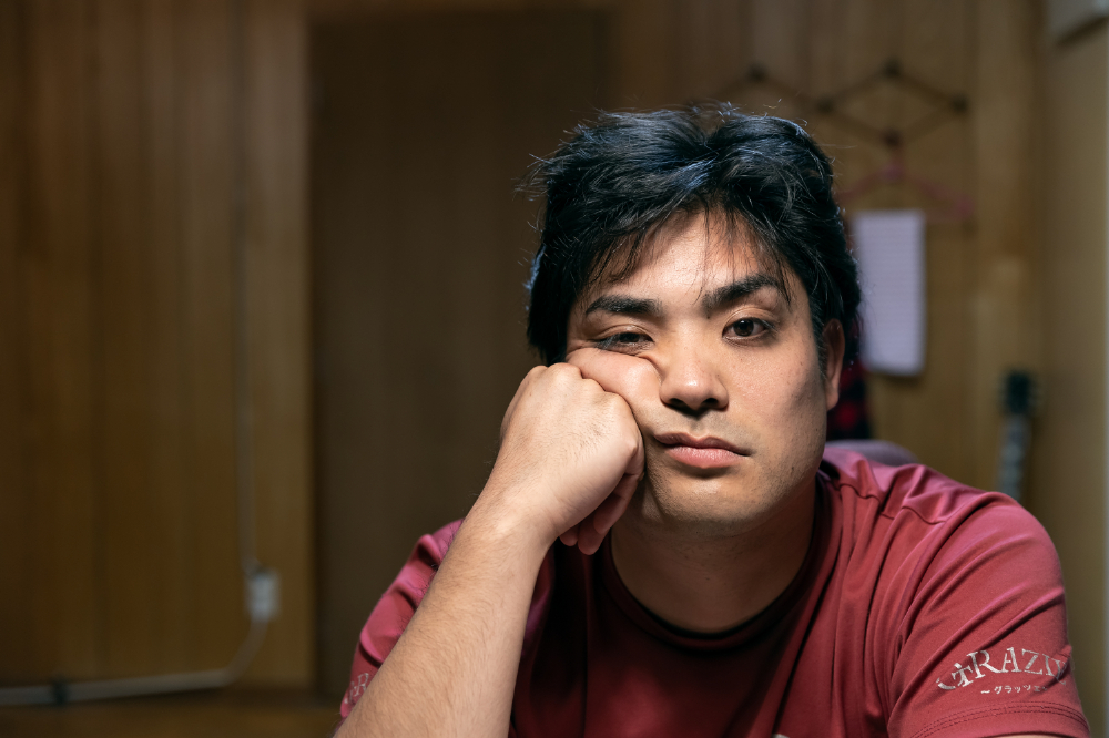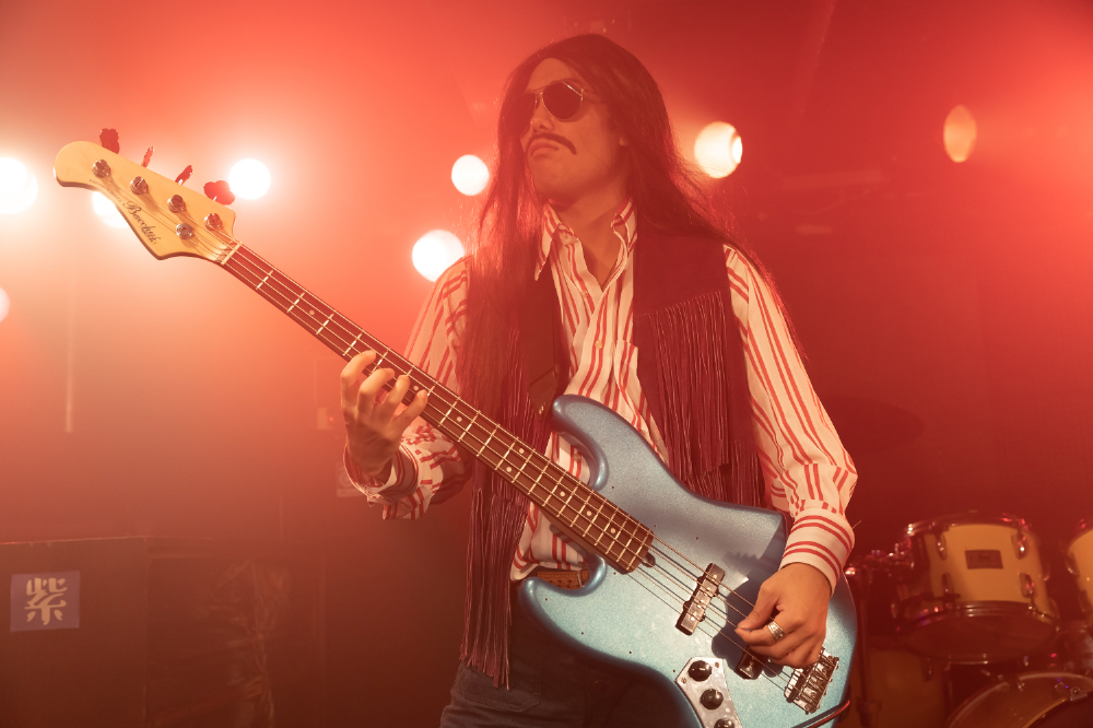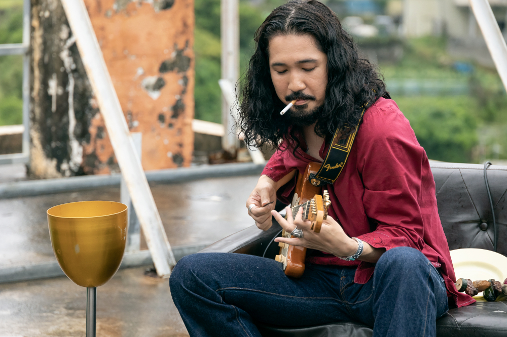 平良 / アカバナー青年会 インパクトのギター。かつては女性ファンの行列ができるほどモテたが今は出会い系アプリに夢中の不良ジジイ。認知症が進んだベースの辺土名といつもオーシャンで飲んだくれている。