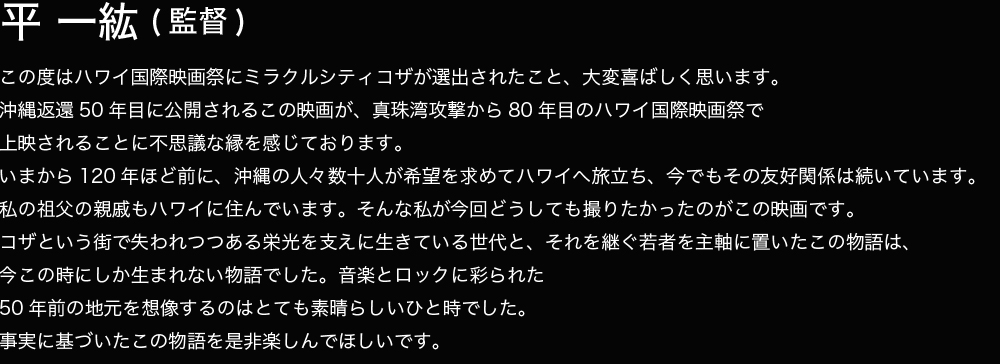 1989年生まれの平 一紘監督が、“アメリカ世”(アメリカ統治の時代)やベトナム戦争当時の沖縄の世相なども盛り込んだ『ミラクルシティコザ』。